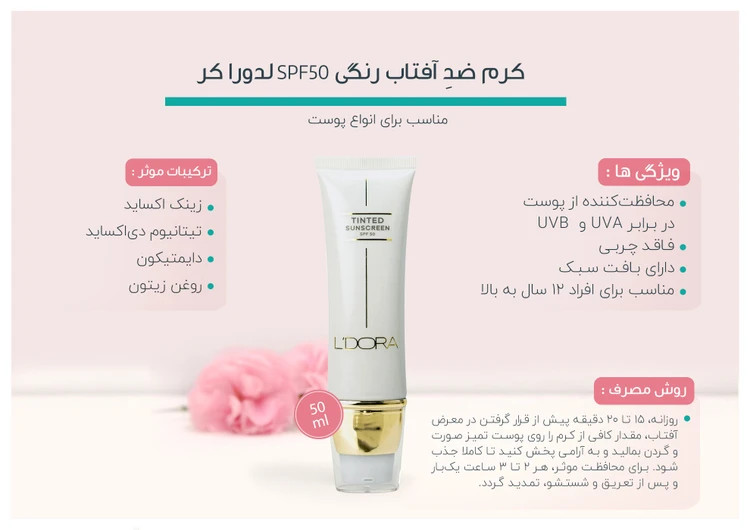 کرم ضدآفتاب رنگی SPF50 لدورا کر 5۰ میلی لیتر