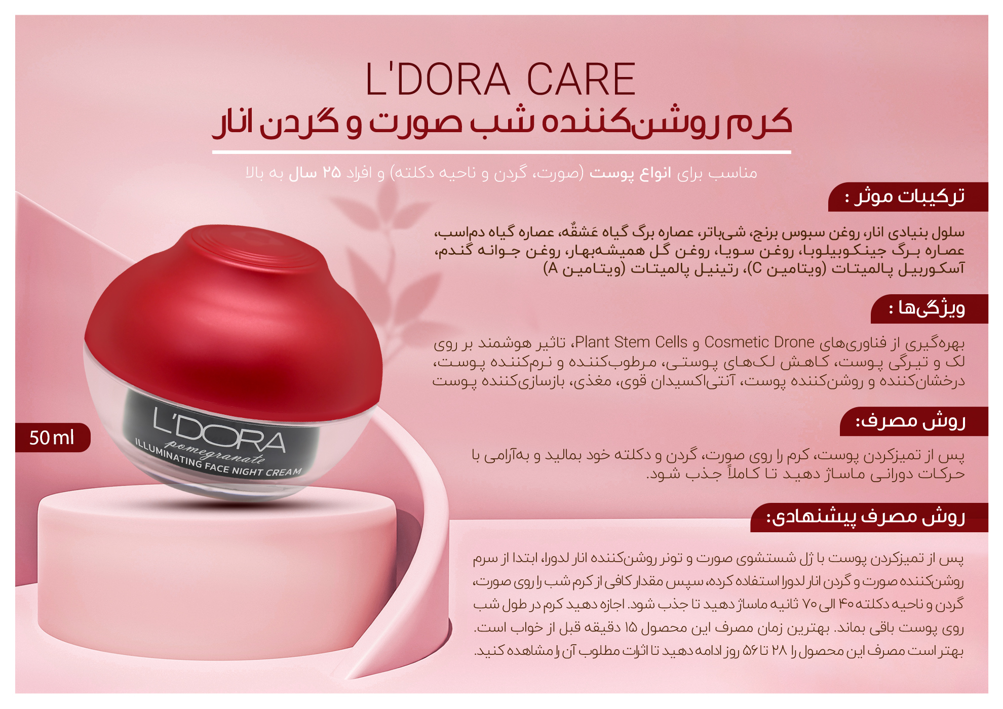 کرم روشن کننده شب صورت و گردن انار مناسب انواع پوست لدورا، 50 میلی لیتر