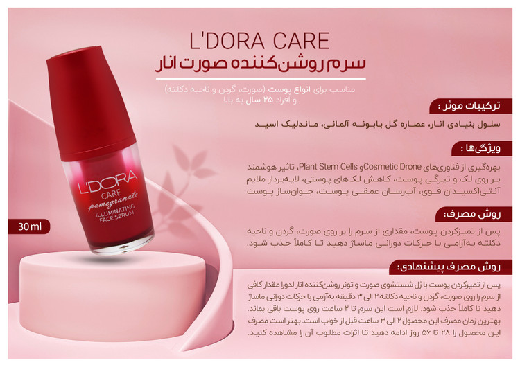 روش مصرف پيشنهادي: پس از تميز کردن پوست با ژل شستشوي صورت و تونر روشن کننده انار لدورا مقدار کافي از سرم را روي صورت، گردن و ناحيه دکلته 2 الي 3 دقيقه به آرامي با حرکات دوراني ماساژ دهيد تا کاملا جذب شود.