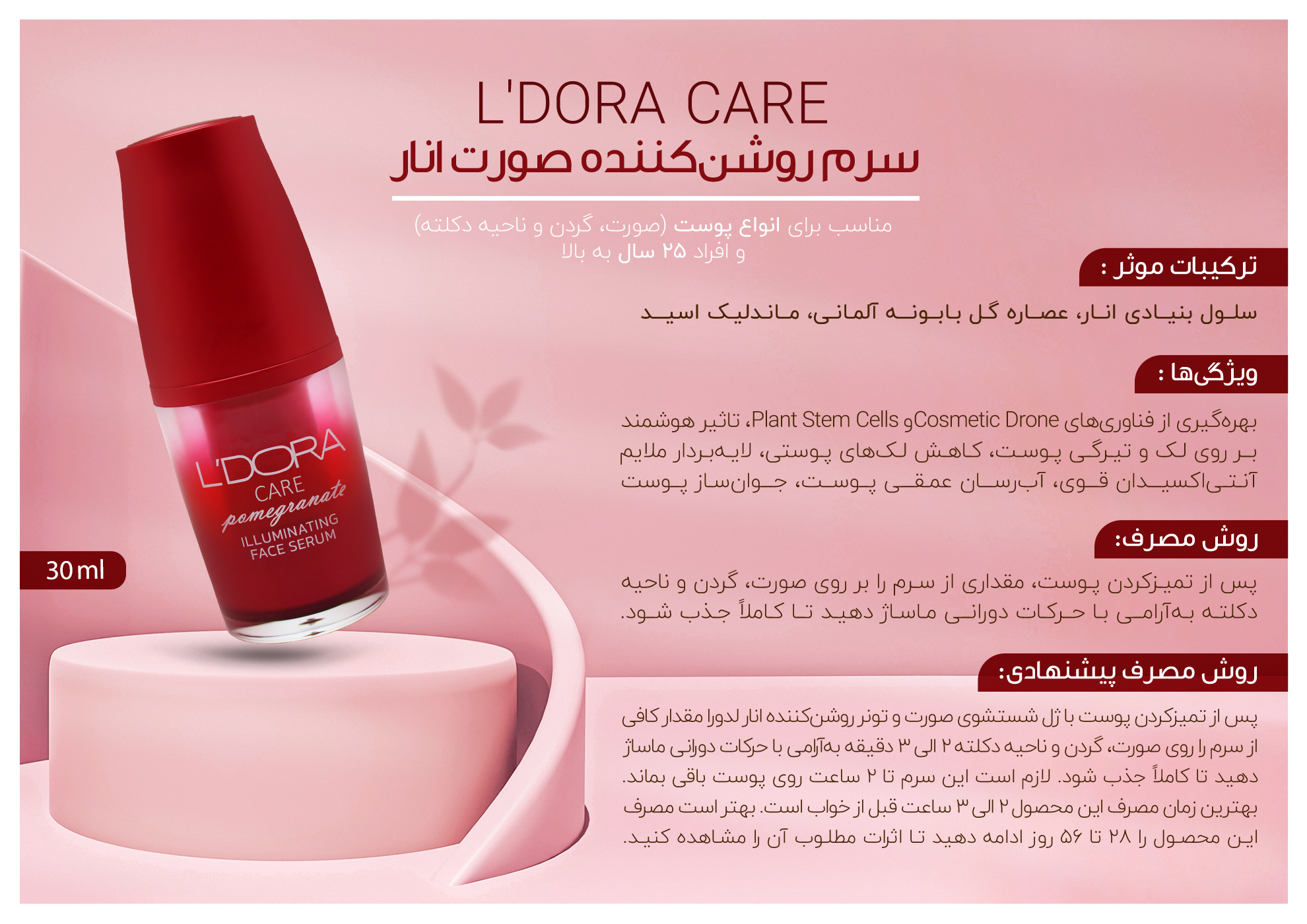 سرم روشن کننده صورت انار مناسب انواع پوست لدورا، 30 میلی لیتر