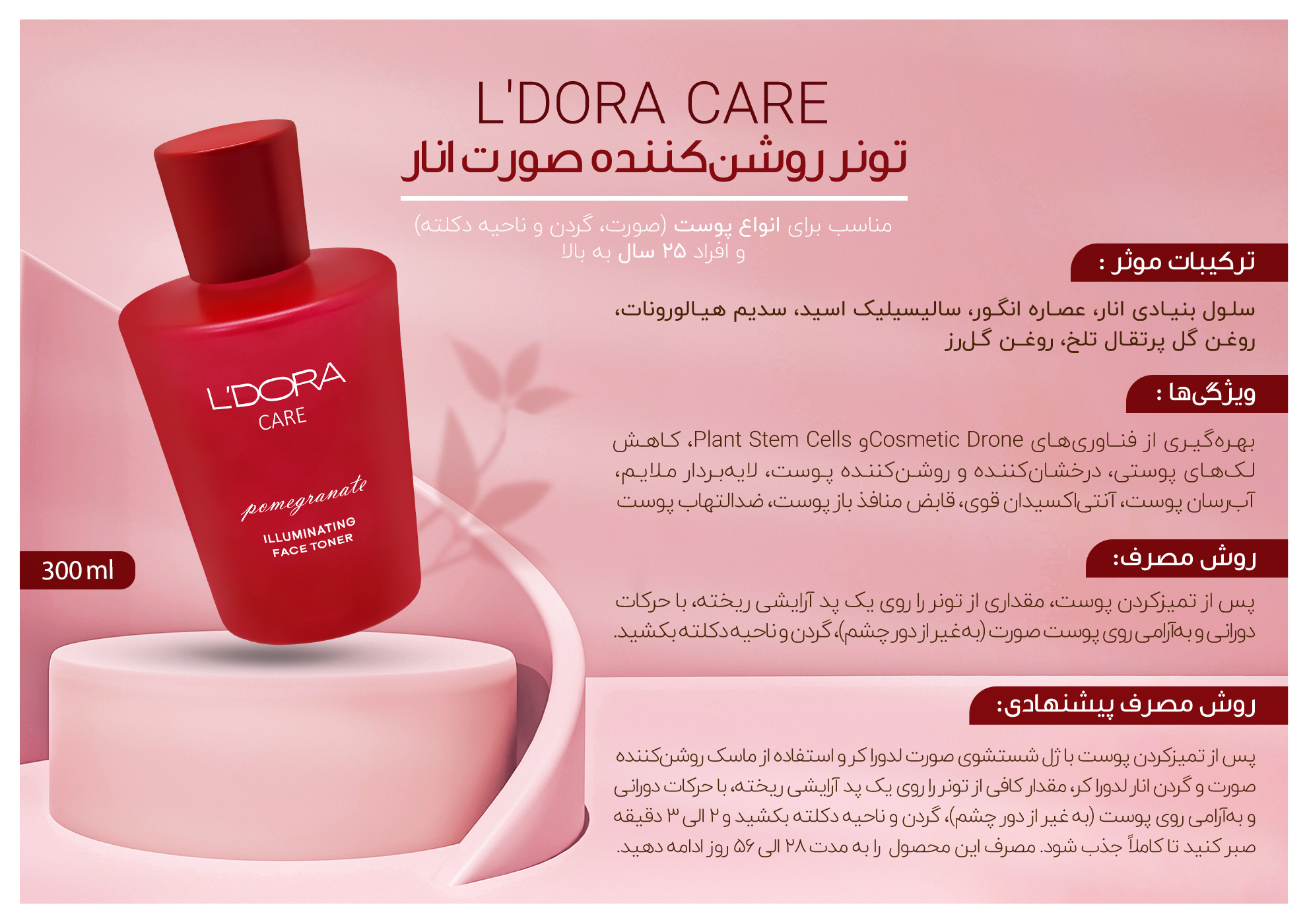 تونر روشن کننده صورت انار مناسب انواع پوست لدورا کر، 300 میلی لیتر